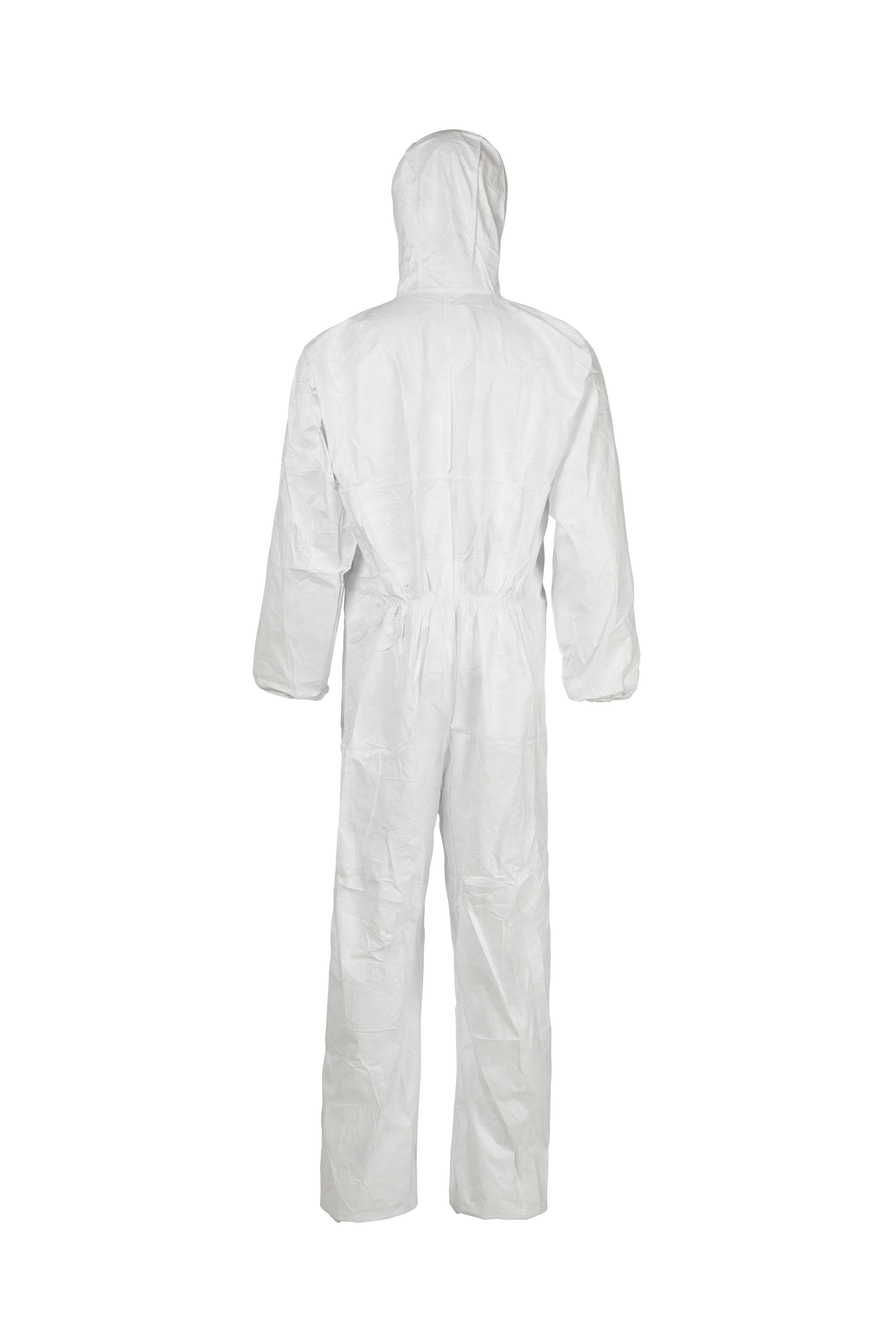 DuPont™ Tyvek® 400, model TY198S WH. Hooded coverall available in white, in sizes SM to 3XL. Stitched external seams. Robust yet lightweight (<180g per garment). 3-piece hood for optimal fit to head and face when turning. Elasticated face, wrists and ankles as well as glued-in waist elastic. Ample crotch area for freedom of movement.